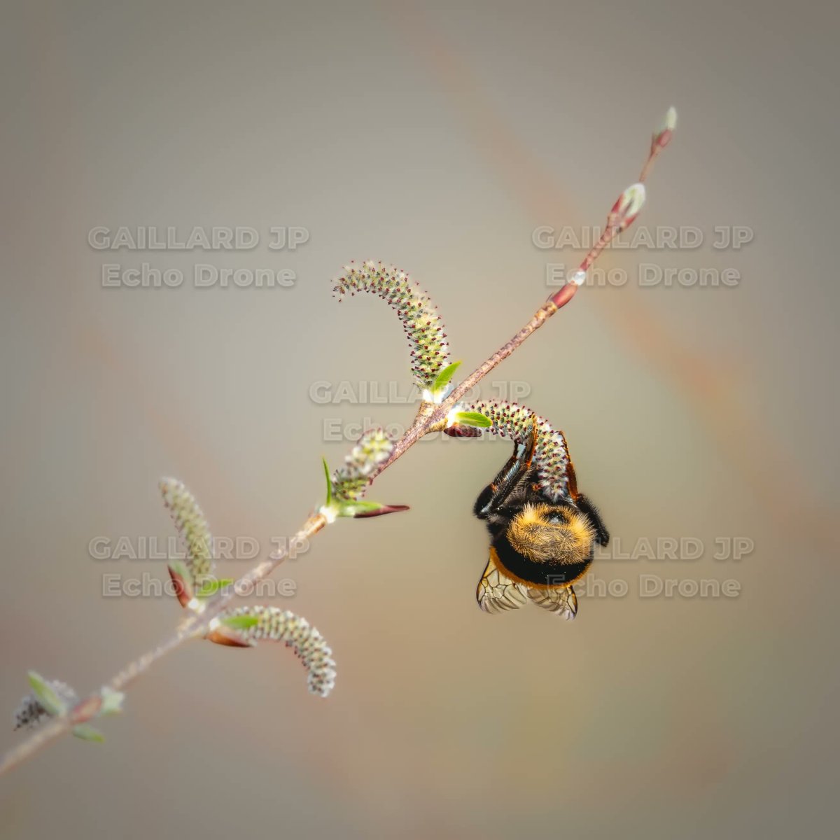 Un instant de vie minuscule au cœur des premiers bourgeons. Ce bourdon, saisi en plein travail de pollinisation, témoigne de l'activité frénétique et indispensable de la micro-faune dès le retour des beaux jours. Une image graphique et douce, captée dans le respect total de ce petit butineur.