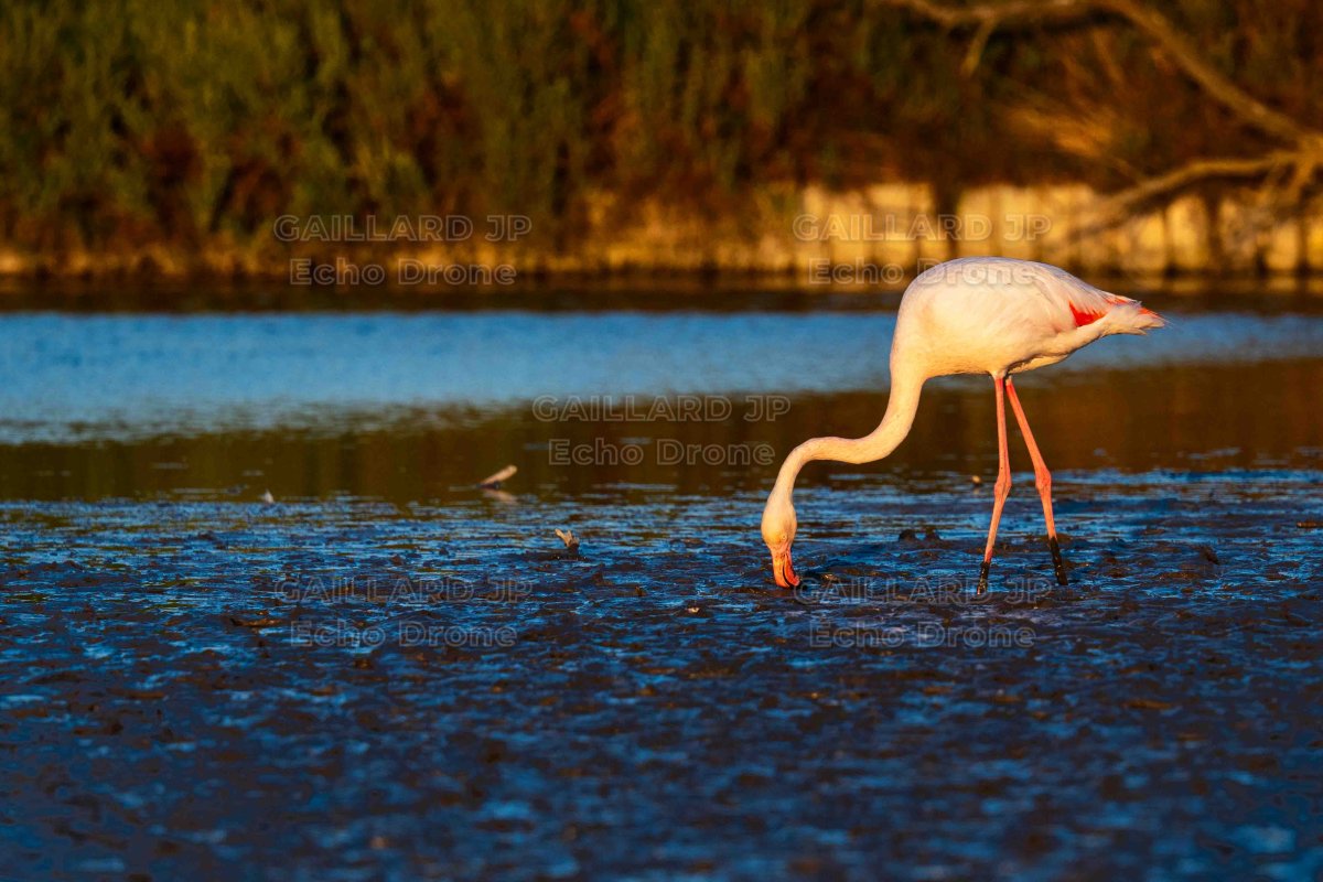 Ce grand filtreur des lagunes est ici saisi dans une attitude noble et curieuse, explorant méthodiquement la vase à la recherche de micro-organismes. Une image qui change le regard sur les habitudes alimentaires de cette espèce, capturant la quiétude d'un repas solitaire dans la lumière flamboyante d'une fin de journée camarguaise.